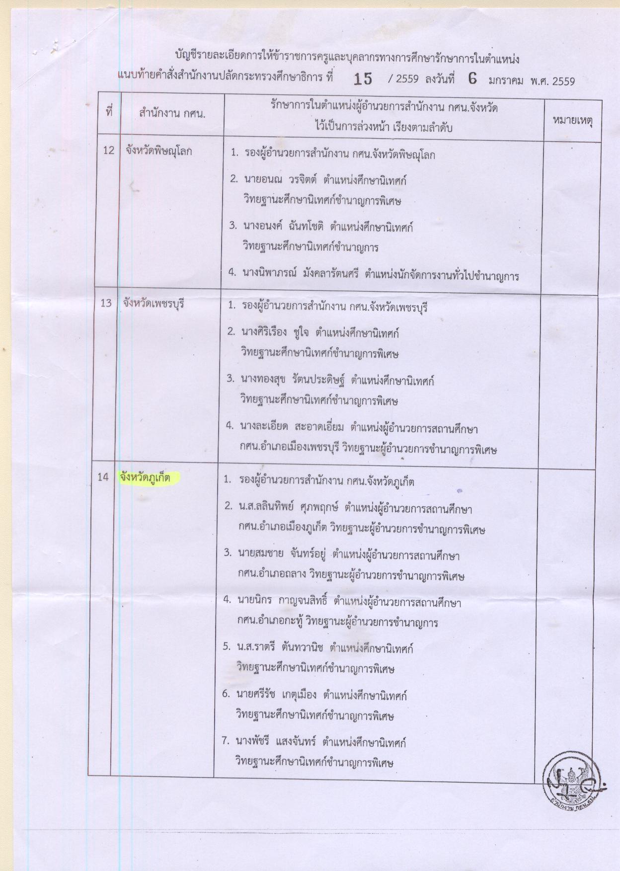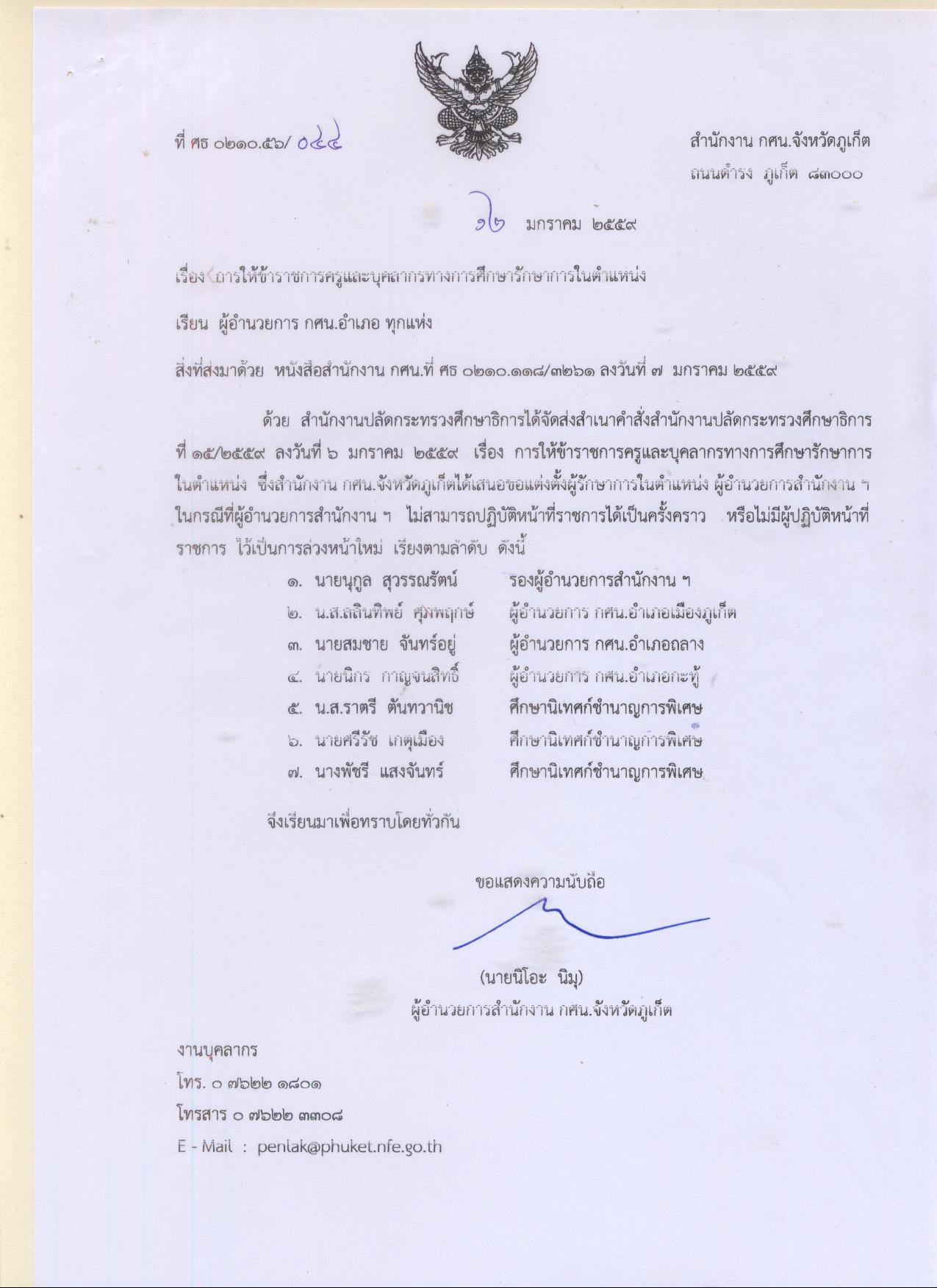 สป.ศธ.ได้ออกคำสั่งแต่งตั้งผู้รักษาการ ผอ.สนง.กศน.จ.ภูเก็ตเป็นการล่วงหน้าใหม่ ดังแนบ