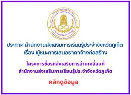 เรื่อง ผู้ชนะการเสนอราคาจ้างก่อสร้างโครงการซื้อรถส่งเสริมการอ่านเคลื่อนที่สำนักงานส่งเสริมการเรียนรู้ประจำจังหวัดภูเก็ต เข้าชม : [6]